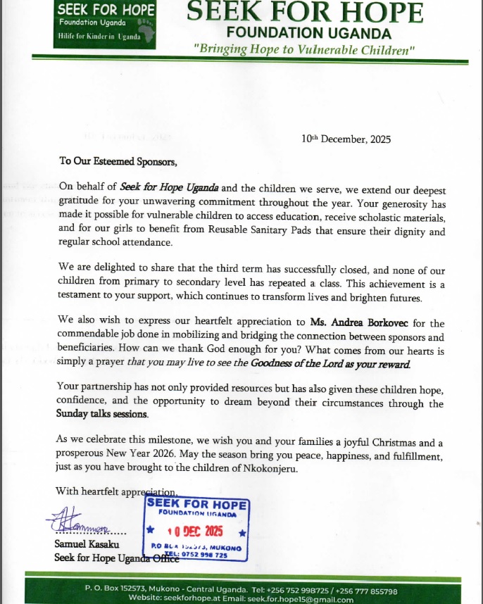 Aber es gibt auch viele positive Nachrichten. Einige Zeugnisse sind : OUTSTANDING, einige SUPER und bis auf 2 sind alle im oberen Bereich der Grades. Es ist wirklich toll zu sehen, wie sich alle sowohl körperlich als auch schulisch toll entwickelt haben. Die hungrigen Augen der ersten Jahre habe ich Gottseidank nicht mehr sehen müssen. Auffallend ist allerdings, dass die Kosten immer höher werden und von manchen Familien nicht mehr gestemmt werden können. So habe ich diesmal nicht nur Schuhe und Schultaschen, sondern auch 60 Hefte, einige Bücher, Taschenrechner etc. kaufen müssen. Auch die Prüfungsgebühren sind für ugandische Verhältnisse ziemlich hoch – da konnte ich, dank eurer Spenden, ebenfalls aushelfen.